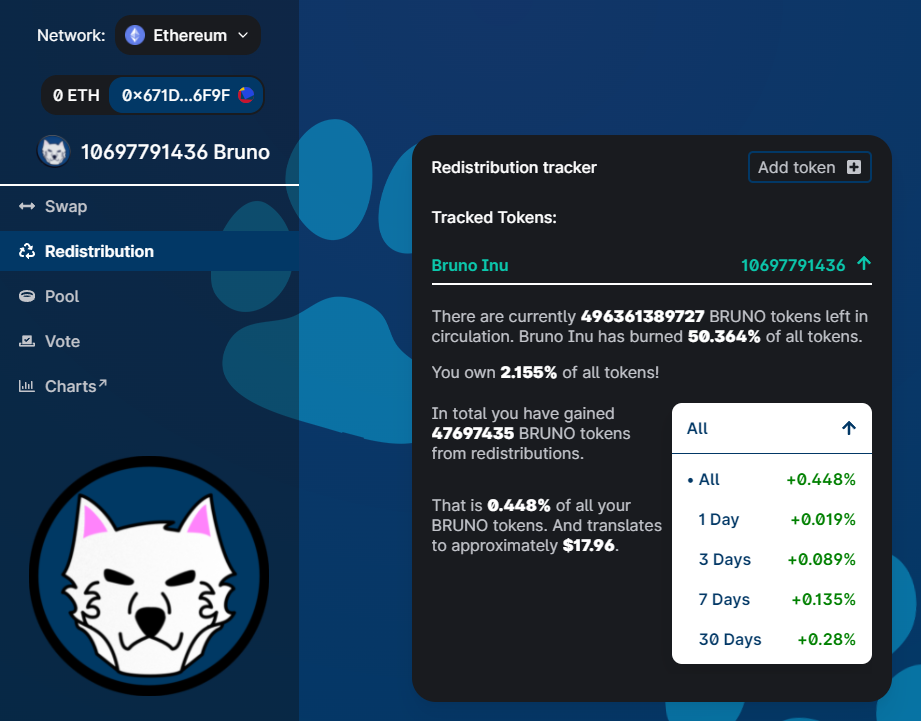 Swap, analyze, earn, and propose on the leading decentralized utilized trading platform. Bruno is a portfolio tracker, accounting, and analytics tool token. Get an edge over everyone else by tracking the behavior and on-chain activity of prominent wallet addresses.